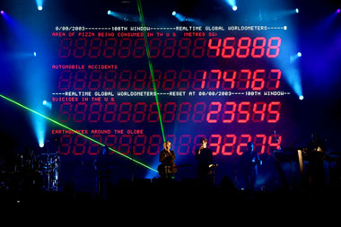 In mezzo ad un pubblico variegato forse tanto quanto quello dei Depeche Mode, in una calda serata qualsiasi di Luglio, a Roma suonano i Massive Attack. E’ un po’ il concerto che non ti aspetti, quello che se ti chiedessero “chi vorresti vedere dal vivo?” tu troveresti almeno altre 85 risposte prima di pensare a loro, ma in effetti li ascolti spesso, i loro pezzi più famosi li conosci benissimo, un paio di loro dischi li hai consumati. Quindi vedermeli (e godermeli) è stato un vero piacere. Due batterie ai lati del palco, cinque microfoni piazzati in prima linea, tastiere, chitarra, basso, una rosa di vocalist da far sbavare ampiamente anche uno che i Massive Attack li ha sentiti solo di striscio (come suppongo fosse il 57% del pubblico, forse anche qualcosina in più.); dietro strumenti e musicisti centinaia di lucine compongono disegni, scritte, bandiere, spettri sonori. Sì, la temperatura non invita ad un bagno di folla ma fortunatamente c’è un venticello che contribuisce a rendere vivibile la serata anche nella stretta mischia vicino al palco. Dopo una mezz’oretta di un djset ampiamente prescindibile le luci si spengono di botto, fanno il loro ingresso i protagonisti della serata, parte “False Flags”, traccia inedita apparsa sul recente Best Of, della quale gira anche ultimamente il video in tv. E subito dopo è il turno di “Risingson”, ecco che entra in scena Daddy G con una voce imponente tanto quanto la sua statura: tutto sarebbe perfetto con un paio di tacche di volume in più ai microfoni e il basso a volte meno saturo. Seguono, in ordine sparso, “Teardrop” (lacrime, nel vero senso della parola, con una Liz Frazer ineccepibile nonostante l’ormai non tanto giovine etade), “Futureproof”, “Angel”, “Butterfly Caught”, “Karmacoma”, “Hymn of the Big Wheel” (la prova di Horace Andy è senza dubbio la migliore della serata), “Unfinished Symphaty” (anche qui acuti di Shara Nelson da brivido), “Inertia Creeps”, qualcos’altro che mi scordo, e chiusura clamorosa con “Group Four”, allungata in un crescendo di luci, feedback e orgasmi (un mio amico, lo stesso presente ai Mogwai, è venuto 5 volte. Parole sue.)