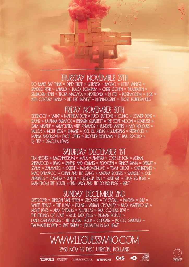 Giovedì 29 novembre inaugura ad Utrecht (NL) la sesta edizione di “Le Guess Who?”. Oltre 100 artisti affolleranno per tutto il week-end locali, teatri e piccoli pub lungo i canali medievali della piccola Amsterdam. “Le Guess Who?” ripercorre le orme del SXSW di Austin, e se per molti il Texas rimane  meta proibita (o proibitiva), respirare il fascino di questo festival potrebbe essere una soluzione adatta e decisamente meno dispendiosa. I biglietti passe-partout e per i singoli giorni sono disponibili via www.leguesswho.com rispettivamente al prezzo di 75€ e 25€. Vista l’impossibilità di allestire un campeggio nel freddo autunno olandese l’organizzazione ha attivato sul proprio sito un sistema di couchsurfing che vi permetterà di dormire comodamente su divani e materassi nei salotti della città.