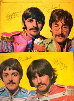 trionfale prende la parola il presentatore della serata che, enfatico, annuncia “..So may I introduce to you /the act you’ve known for all these years/Sgt. Pepper’s Lonely Hearts Club Band”. Immediatamente subentra il gruppo che procede con le (auto)presentazioni: “We’re Sgt. Pepper’s Lonely Hearts Club Band / We hope you will enjoy the show / We’re Sgt. Pepper’s Lonely Hearts Club Band / Sit back and let the evening go”. Se si esclude un ‘solo di chitarra un po’ troppo audace – non a caso ripreso in un live sull’Isola di Wight da Jimi hendrix, altra icona del 900 indirettamente coinvolta – lo stile è smaccatamente riconoscibile come beatlesiano, con uno stile corale a quattro voci che ricalca quello di “Love Me Do” e dei primi successi, quando il gruppo stava approdando alle classifiche dopo una lunga gavetta come orchestrina da ballo. “…It’s wonderful to be here/ It’s certainly a thrill / You’re such a lovely audience / We’d like to take you home with us / We’d love to take you home…” sono frasette di circostanza rivolte al pubblico che i nostri dovevano aver ripetuto un milione di volte, tanto nelle sale da ballo quanto sui palcoscenici internazionali, d’innanzi a delle audience spesso diverse soltanto nel numero. Torna dietro il microfono il presentatore virtuale “I don’t really want to stop the show/ But I thought that you might like to know/ That the singer’s going to sing a song/ And he wants you all to sing along/ So let me introduce to you/ The one and only Billy Shears/ And Sgt. Pepper’s Lonely Hearts Club Band” : in questo modo viene presentato il frontman della band, tale Billy Shears che – almeno nel primo pezzo – ha la voce di Ringo Starr. Nella sua parte iniziale infatti “With a little Help from My friends” si lega al pezzo che l’ha preceduta: “What would you think if I sang out of tune /Would you stand up and walk out on me /.Lend me your ears andI’ll sing you a song /And I’ll try not to sing out of key / Oh, I get by with a little help from my friends”. I riferimenti metatestuali alla condizione del cantante pop e alla pratica diffusa di far cantare il pubblico sono conditi con urletti ed applausi pre-registrati. E’ la beatlemania ad essere campionata e portata su disco, secondo quello che diverrà un artificio frequente nei dischi, il cosiddetto “live in studio”. Al procedere delle tracce lo stile beatle song lascerà spazio ad arrangiamenti e suoni più elaborati come le suggestioni indiane di “Within or without you”, roba che nemmeno Revolver era riuscito ad anticipare. Con Billy Shears e la banda del Sergente Pepe a fare da controfigura, gli originali sono liberi di sperimentare, di andare oltre quanto seminato fino ad allora. I loro comodi alter ego torneranno sulla penultima canzone, una ripresa delle note d’apertura: “We’re Sergeant Pepper’s Lonely Hearts Club Band/We hope you have enjoyed the show… We’re sorry but it’s time to go/ Sergeant Pepper’s Lonely Hearts Club Band/ We’d like to thank you once again… It’s getting very near the end”. Il gran finale si avvicina ma ancora non è arrivato: per l’ultima volta applausi e grida finte si attenuano per accogliere quello che probabilmente è l’articolo più rappresentativo del lotto.